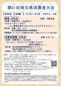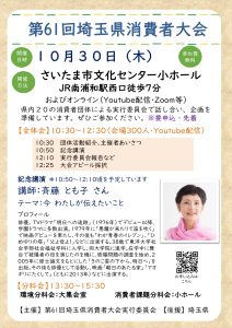 【お問合せ】第61回埼玉県消費者大会事務局(埼玉県生協連内)048-844-8971(月~金 9:30~17:00)